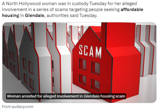 Glendale 시 당국은 지난 9일(화)에 한 여성이 저렴한 주택에 관심있는 사람들을 상대로 일련의 사기행위를 저지른 혐의로 검거됐다고 밝혔다.