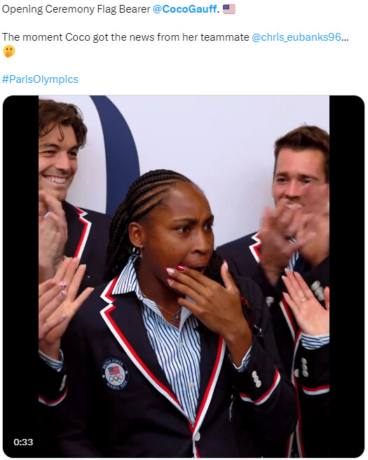 선수들 투표에 의해서 결정된 코코 가우프는 이미 확정된 남자 기수 르브론 제임스(39)와 함께 올림픽 개막식에서 미국 선수단 맨 앞에서 입장하게 된다.