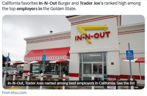 캘리포니아의 대표적인 햄버거 체인 인앤아웃(In-N-Out)과 식료품점 체인 트레이더 조스(Trader Joe’s)가 올해(2025년) 포브스(Forbes)가 발표한 ‘주별 최고의 고용주’ 리스트에서 상위권에 올랐다.