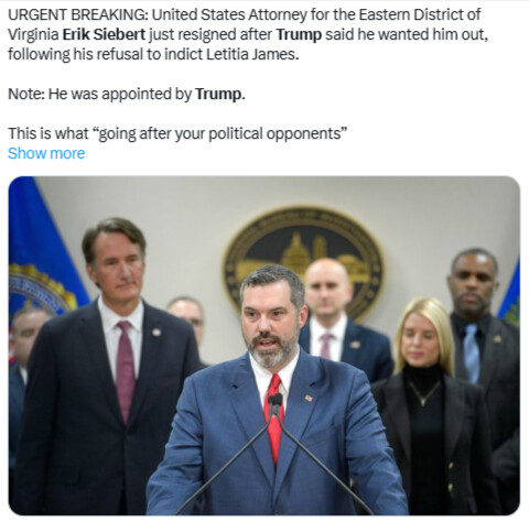 기대와 달리 주택담보대출 사기 혐의 수사에서 진전이 없자, 에릭 지버트(Erik Siebert) 버지니아 동부 연방검사를 해임해야 한다고 트럼프 대통령이 기자들 앞에서 공개적으로 주장하고 나선 것이다.