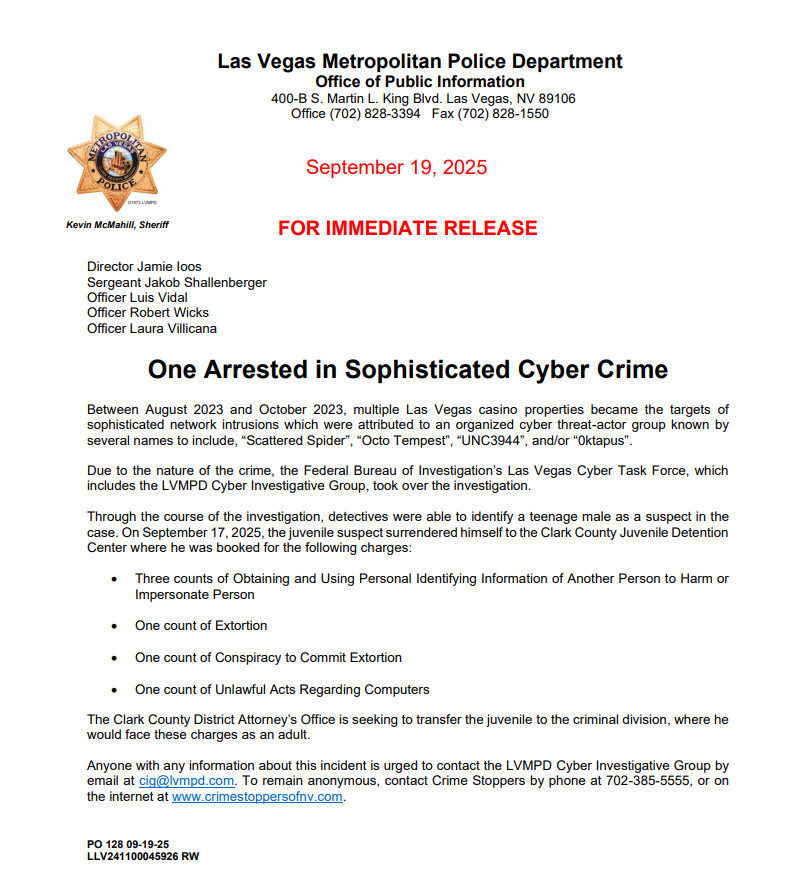 라스베가스 대형 카지노 업체들을 대상으로 이뤄진 사이버 공격에 연루된 미성년자가 구금됐다.