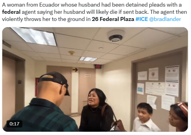 지난 25일(목) NY 연방 이민법원(26 Federal Plaza) 부근에서 ICE 요원이 한 여성을 거칠게 밀어붙여서 벽 쪽으로 밀려 넘어지게 했다