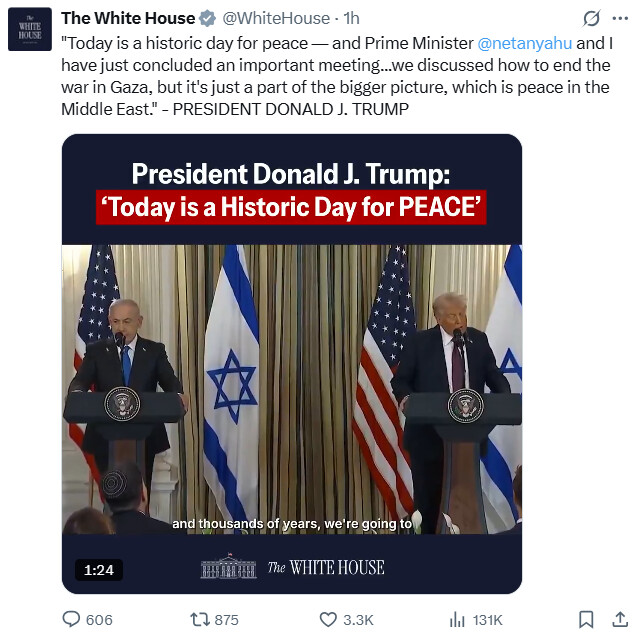 네타냐후 총리는 트럼프 대통령의 발언 직후 오늘 우리는 전쟁 종식을 위한 중요한 발걸음을 내디뎠으며, 중동에서 평화를 극적으로 증진하기 위한 무대를 마련했고 가자지구 전쟁 종식을 위한 당신의 계획을 지지한다며 합의 사실을 확인했다.