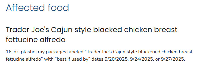 는 트레이더 조와 월마트에서 판매된 마켓 사이드 링귀니 쇠고기 미트볼 앤 매리나라 소스(Marketside with beef meatballs and mafinara sauce)제품과 케이준 스타일 블랙큰드 치킨 브레스트 페투치니(Cajun style blackened chicken breast fettucine)제품 일부에서 리스테리아균 오염이 확인됐다며 리콜 명령을 내렸다.