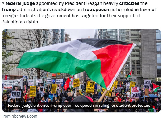 한 연방 판사가 어제(9월30일) 열린 재판을 통해서 팔레스타인을 지지하는 시위를 했다는 이유로 도널드 트럼프 행정부의 표적이 됐던 외국인 학생들의 손을 들어주는 승소 판결을 내렸다.