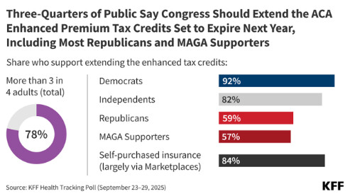 오늘(10월3일) 발표된 KFF(카이저 가족 재단) 여론조사 결과, 미국 성인들의 78%가 올해(2025년) 연말에 만료될 예정인 ACA 보험 시장의 세금 공제 혜택을 의회가 갱신해야 한다고 답했다.