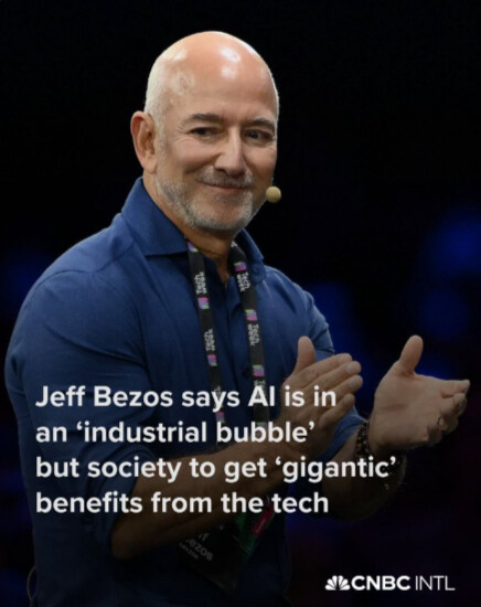 아마존 창업자 제프 베이조스(Jeff Bezos)가 오픈AI CEO 샘 알트만(Sam Altman)의 견해에 동조하며 현재 인공지능(AI) 시장에 '버블(거품)'이 존재한다고 인정했다.