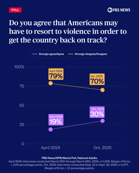 비록 강력한 대다수인 70%는 여전히 폭력에 반대하고 있지만, 이같은 수치의 증가는 최근 보수 활동가인 찰리 커크 암살 사건 등 일련의 정치적 폭력 행위가 발생한 이후 나온 것이라 우려를 낳고 있다.
