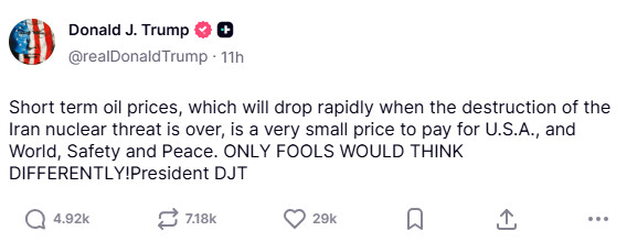 트럼프 대통령은 “이란 핵 위협이 파괴되고 나면 단기적으로 오른 유가는 급격히 하락할 것”이라며 “이는 미국과 세계의 안전과 평화를 위한 아주 작은 대가”라고 적었다.